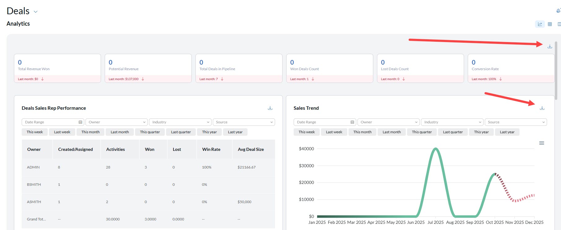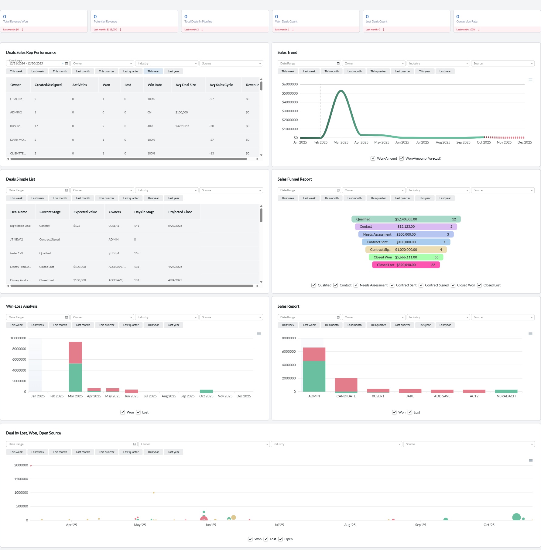 This feature provides a comprehensive view of sales performance and deal activity across different dimensions. It includes tools to track revenue trends, analyze sales funnels, and evaluate performance. Users can monitor metrics such as total deals won, win rates, deal values, and time-based revenue changes using visual reports like funnels, bar charts, and bubble charts. These sections help identify sales patterns, measure productivity, and optimize deal management strategies.
