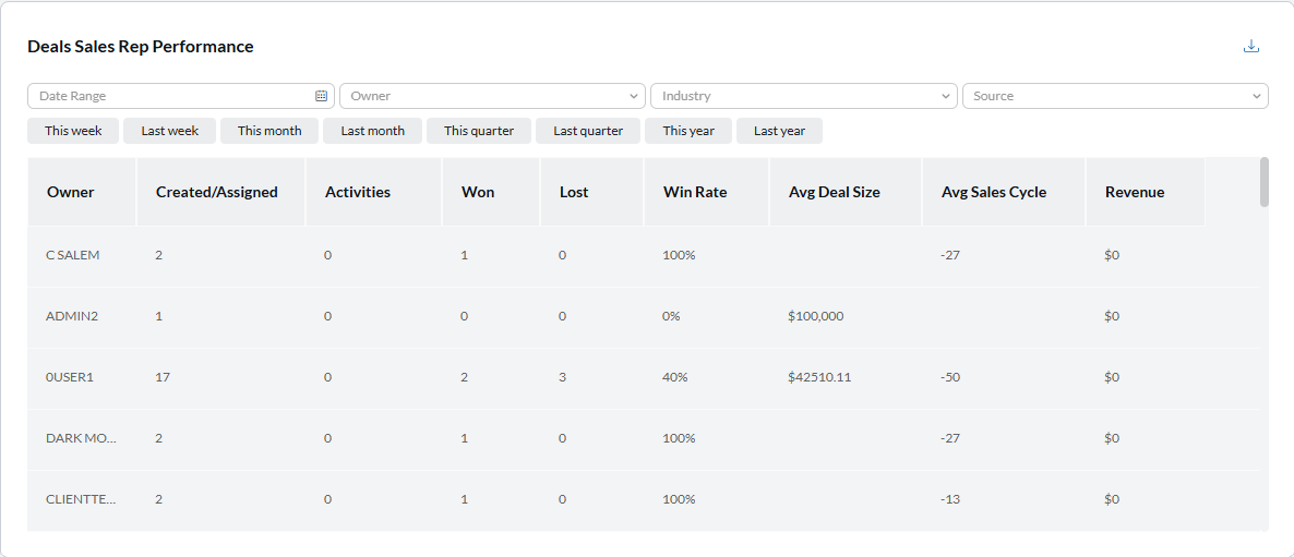 This section provides information on the overall performance of each User based on different metrics such as total Deals Won, Win Rate, and Revenue.