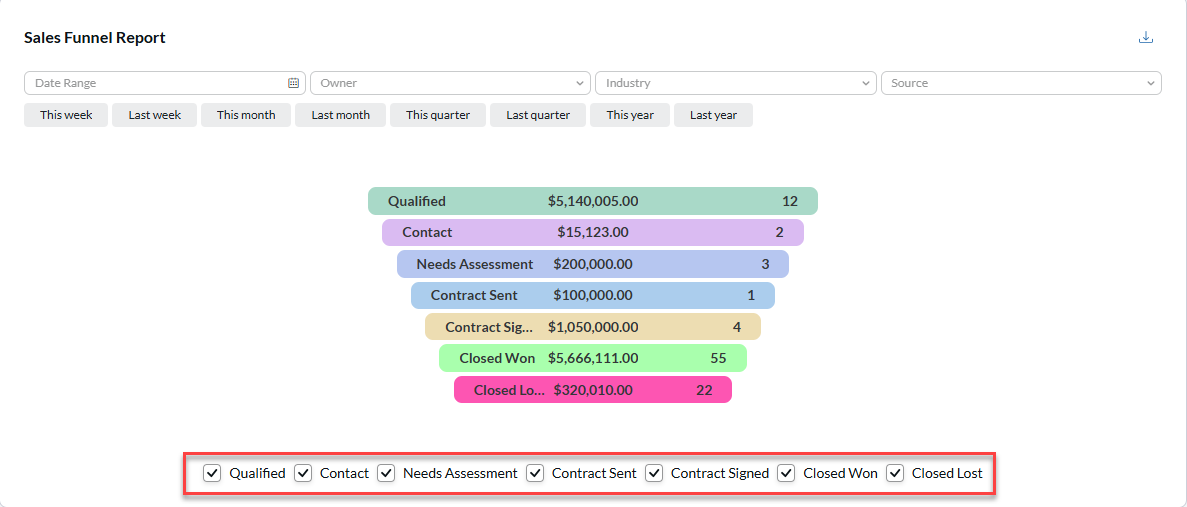 This section shows a funnel of deals and totals of deals in each stage. This section can be additionally filtered by adding or removing the Deal stage at the bottom of the chart