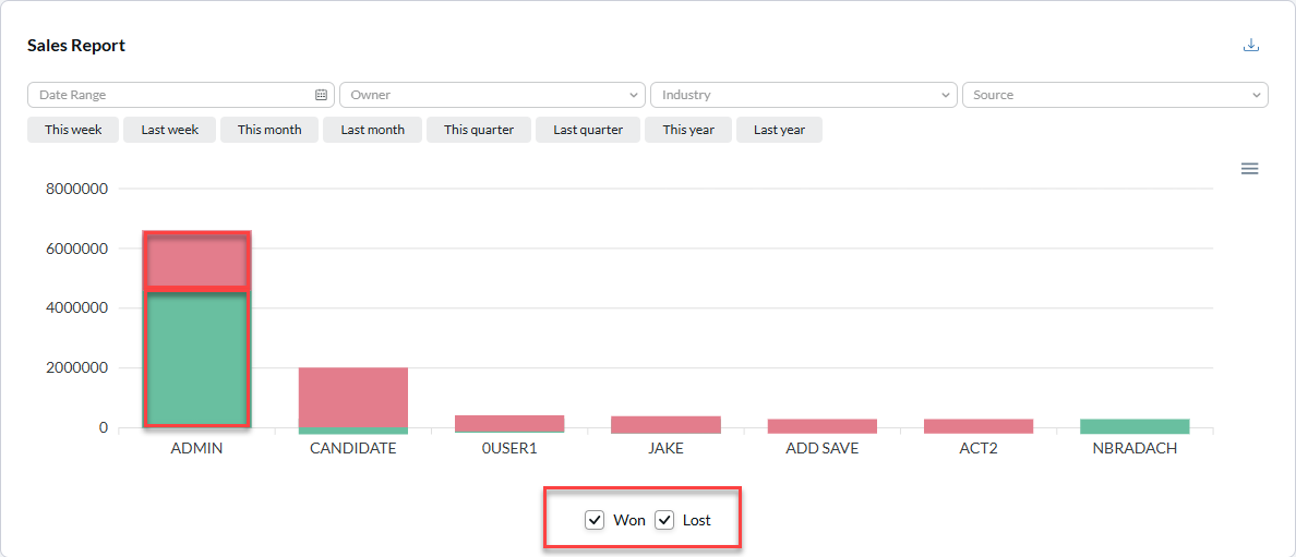 This section shows a bar graph of the deals that have been won (green) against the deals that have been lost (red). This provides a clear analysis on performance based on Users.
