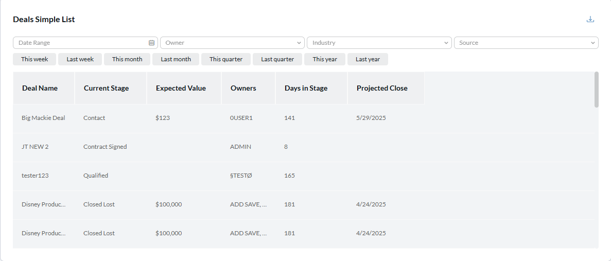 This section will display any over-all list of current deals with information regarding their current status, potential value, user, and total days since the deal was created