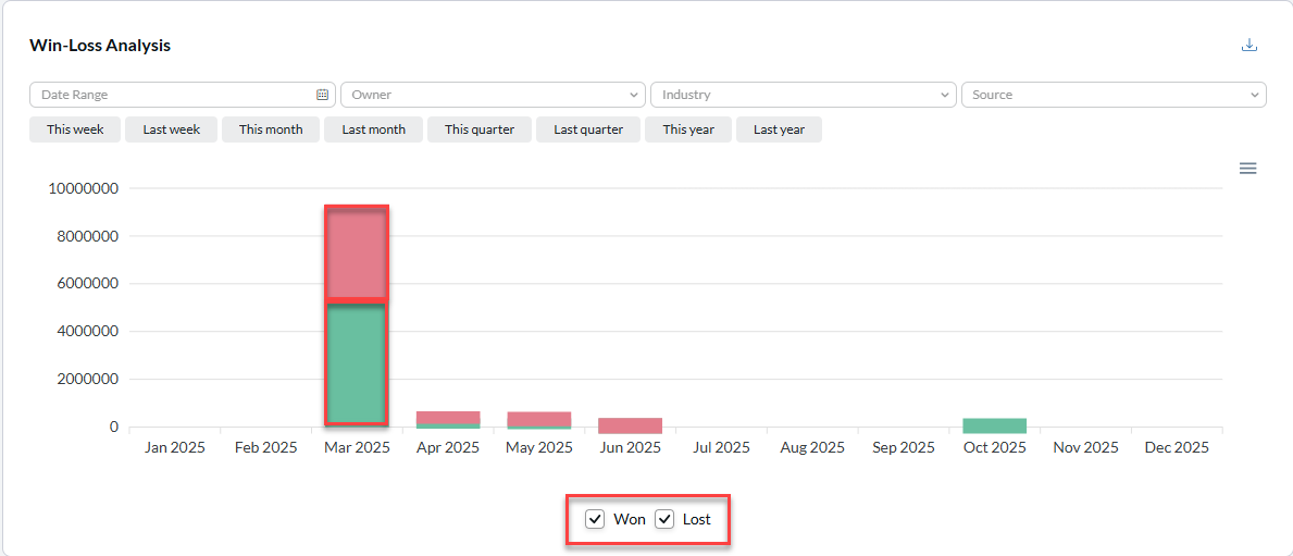 This section shows a bar graph of the deals that have been won (green) against the deals that have been lost (red). This provides clear visibility on these ratios in a monthly breakdown.